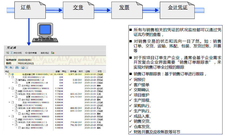 在SAP中只需要有銷售訂單,就能查詢與這個銷售訂單關聯(lián)的大部分重要業(yè)務憑證數據,做到了數據的簡便快捷查詢和業(yè)務數據的一體化。