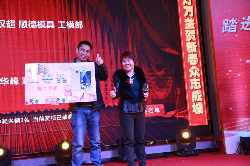 與此同時,節目流程中穿插了員工最受關注的幸運大抽獎。本年度抽獎獎品非常豐富,包括5000元現金獎、IPad mini 4、格力手機、華為手機、TCL智能除濕機、TCL電暖器、臺地扇、多用途電熱鍋以及商場購物劵等,共計1109份獎品,中獎率達60%。除此之外,集團常務副總裁何偉先生、集團組織及營運副總裁成再育先生各贊助現金大獎3000元,讓在場的同事們一次次沸騰起來。最后,總裁莫綺顏女士現場贊助了現金大獎5000元,把晚會現場的氣氛推上了最高潮,引領順威人在華燈匯聚之下,歡聲不斷,激情吶喊。